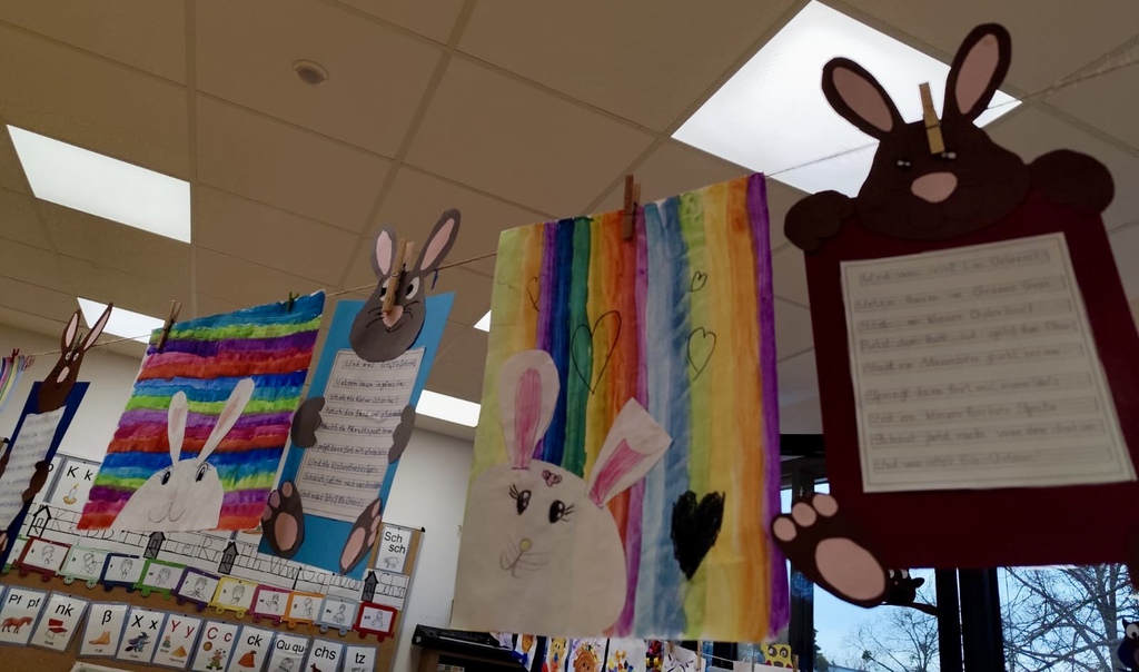 In der ersten Klasse wurde es in den letzten Tagen besonders fröhlich und bunt: Passend zur Frühlings- und Osterzeit haben die Kinder mit viel Freude ihren Klassenraum geschmückt. Mit selbstgemalten Hasen und einer bunten Blumenwiese entstand eine frühlingshafte Atmosphäre, die alle zum Lächeln brachte.