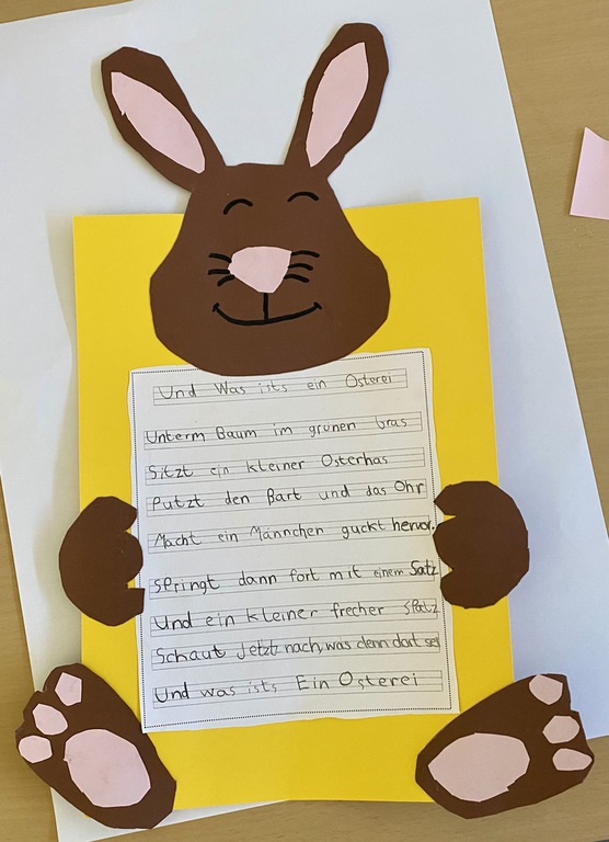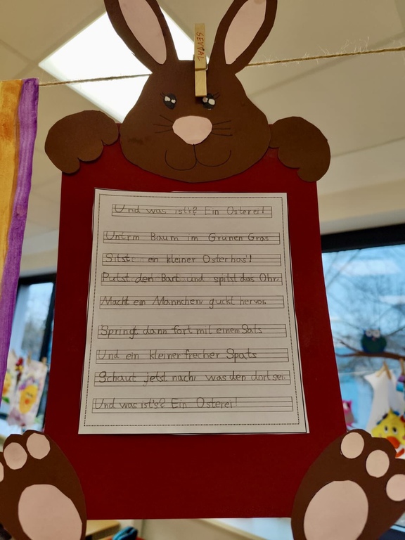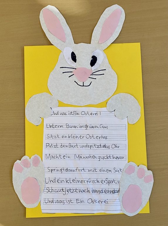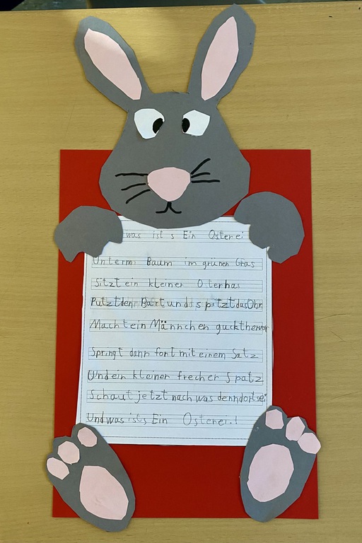 Die Kinder bastelten mit großer Sorgfalt und Kreativität einen Hasen und schrieben in Feinschrift ein Ostergedicht ab, das sie auch gemeinsam einübten.