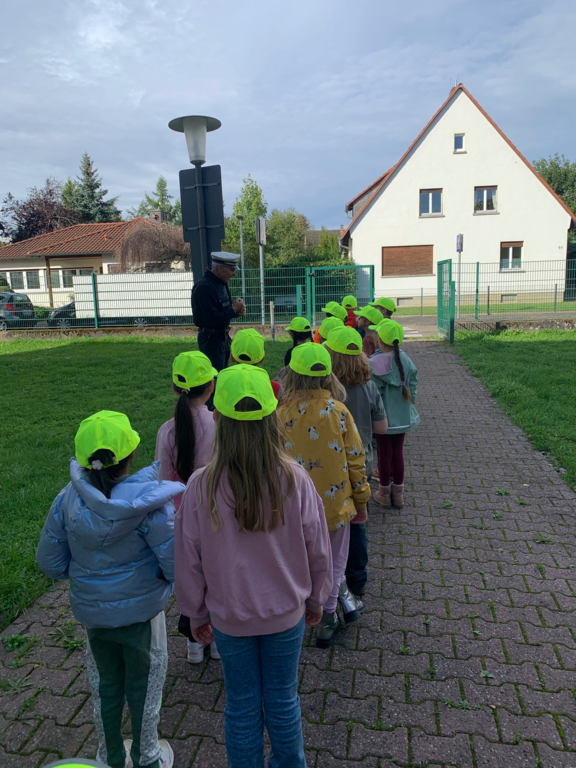 Damit die Kinder auch in der dunklen Jahreszeit auf ihrem Schulweg gut zu sehen sind, bekam jedes Kind eine neongelbe Kappe der Verkehrswacht mit Reflektorstreifen geschenkt.